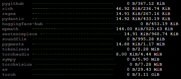 필요한 패키지를 자동으로 다운로드 받는 중입니다. 역시 torch 설치에 가장 오랜 시간이 소요됩니다.