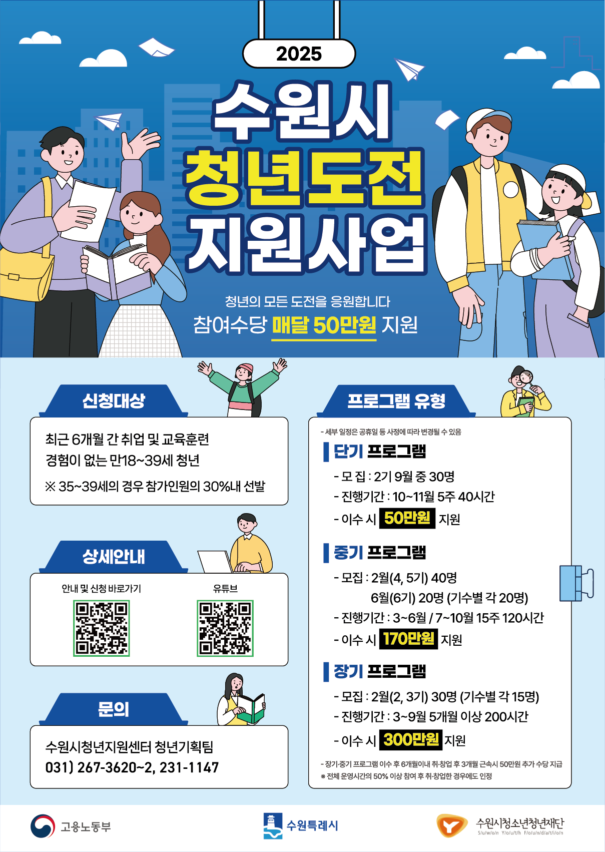 | 수원시 청년도전지원사업 | 구직단념 청년 (19~39세) | 참여수당 및 취업 인센티브 지급 | 수원시청 또는 수원시청년지원센터 |