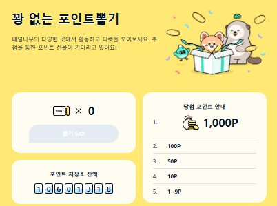 설문을 1회 완료할때마다 포인트 뽑기권도 줘서 쏠쏠하더라구요 50원은 가끔나오고 100원도 당첨된적이 있습니다. 짧은 설문을 빠르게 마무리하고 포인트 뽑기로 적립하는 것도 하나의 방법이더라구요.
